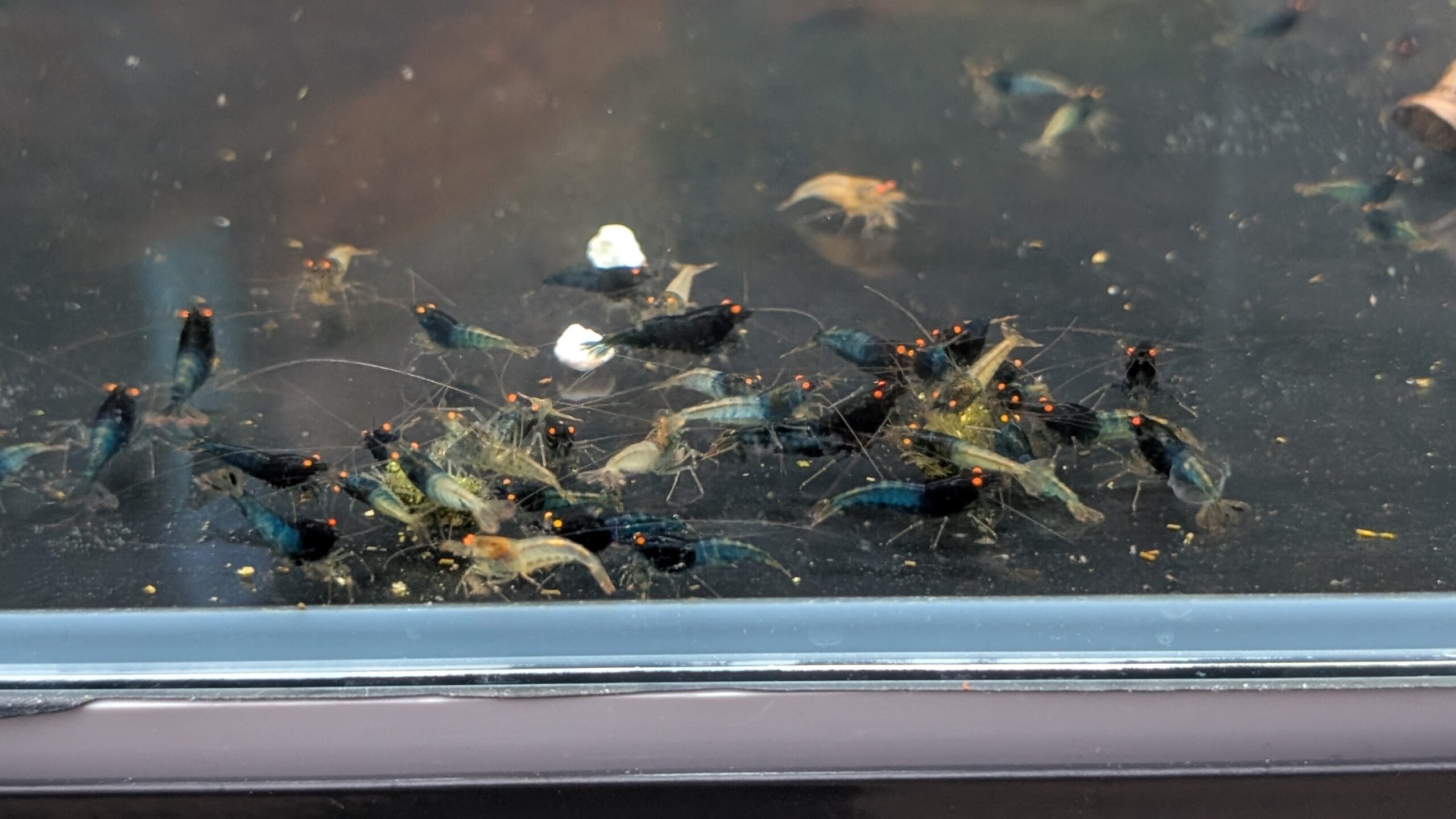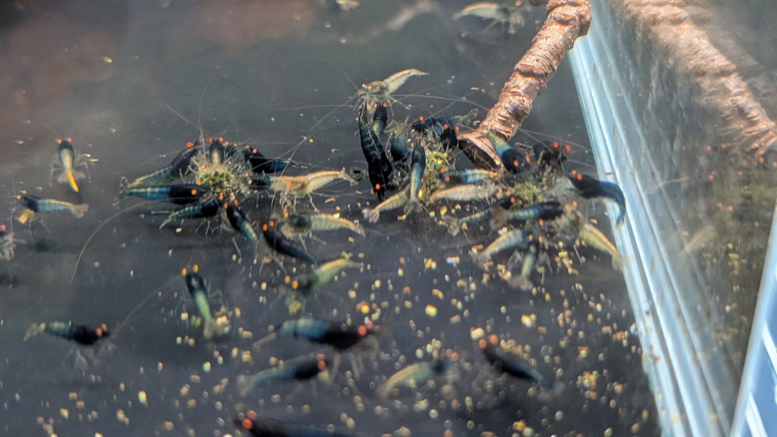 Behov for motion: Det anbefales at rejerne både har rigeligt med plads til at svømme og overflader at gå på. Igen anbefales en reje pr. liter vand.