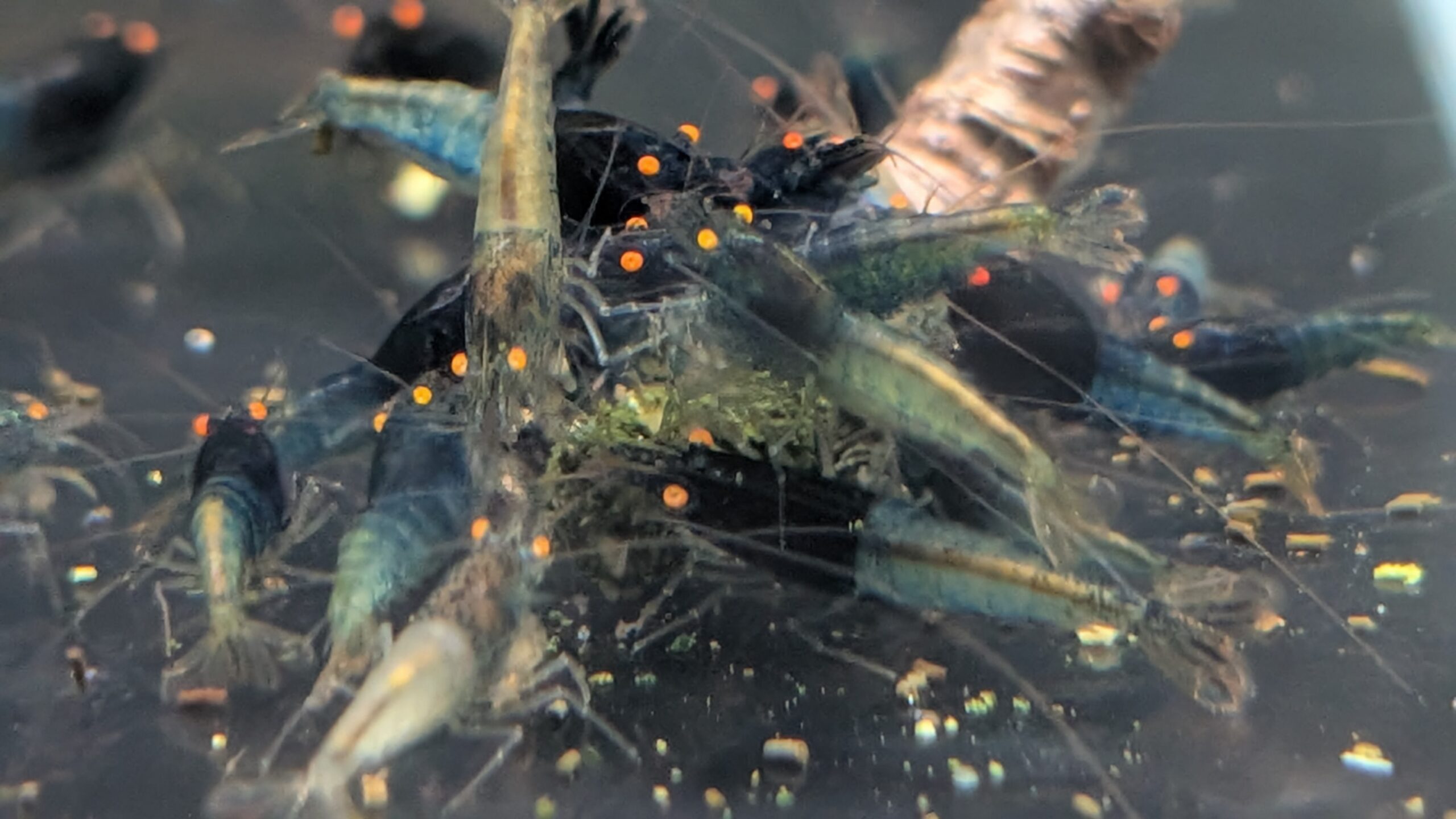 Alle rejerne har OE (orange eyes), men kan være forskellige i farve, mønster mm. I denne mix er de ikke særligt farverige. Fokus er i stedet på øjnene (OE).